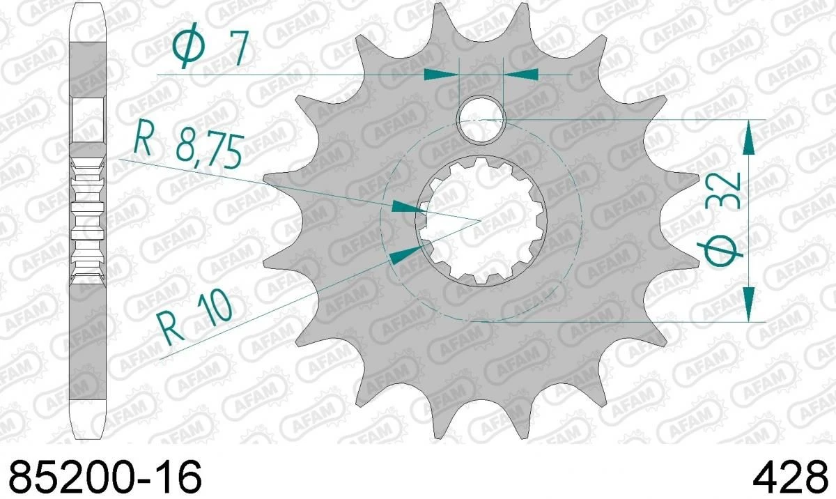 Een stalen 16 tands AFAM voortandwiel. De tandwielen van AFAM zijn gemaakt van C45 staal met inductie geharde tanden, het tandprofiel is concentrisch, plat en perfect rond. Door deze samenstelling zijn de AFAM tandwielen perfect ter vervanging of zelfs ter verbetering van de OEM tandwielen.