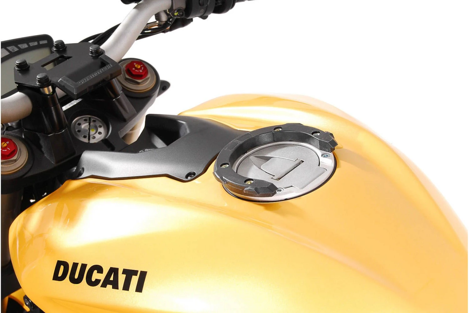 Motorspecifieke tankring die de basis vormt voor de bevestiging van een Quick-Lock tanktas van SW-Motech. Met deze tankring kan de tanktas niet meer schuiven en zit hij muurvast op de motor. Hierdoor wordt de kans op krassen en beschadigingen aan uw tank verkleind.